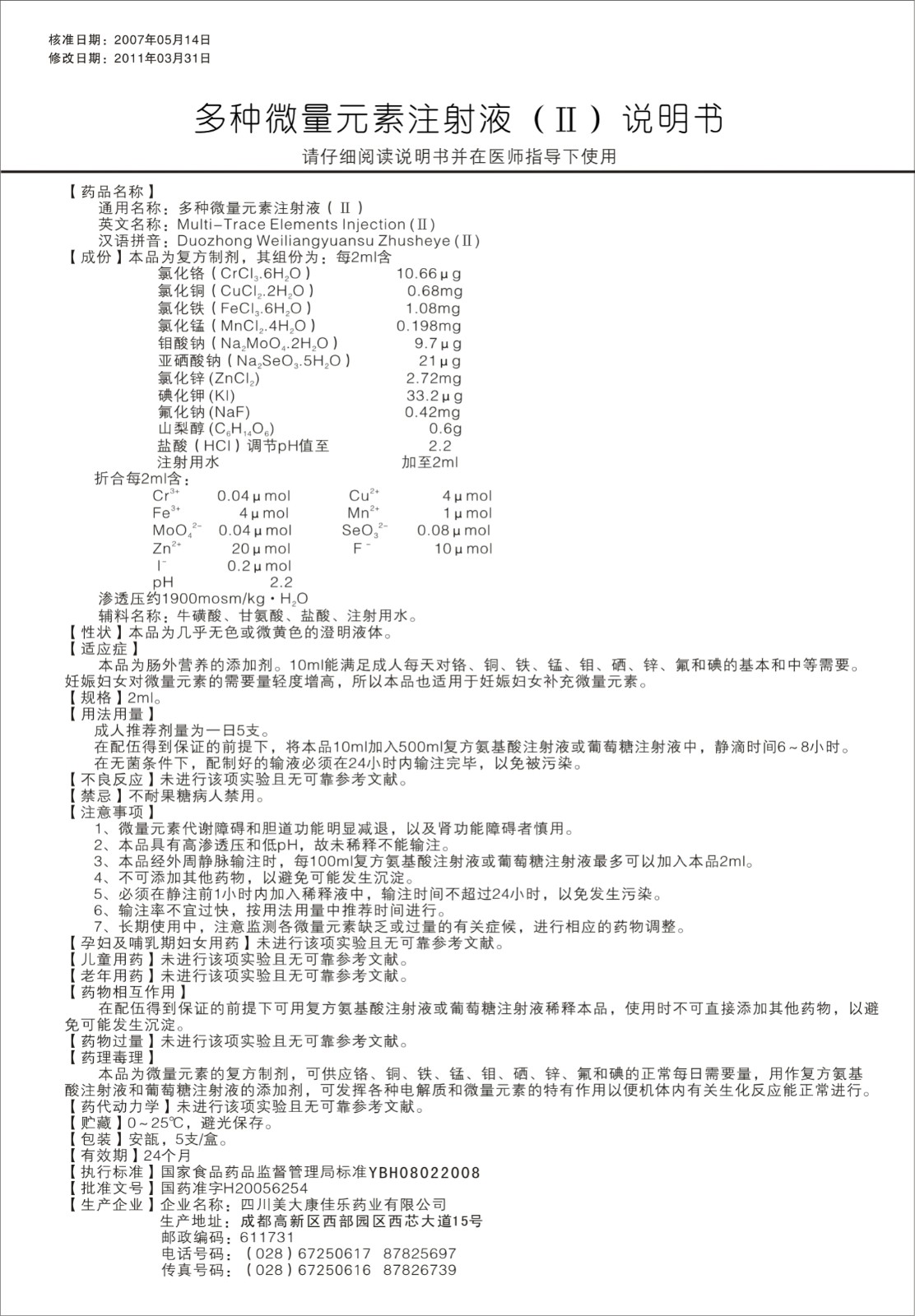 本品為腸外營養的添加劑。10ml能滿足成人每天對鉻、銅、鐵、錳、鉬、硒、鋅、氟和碘的基本和中等需要。妊娠婦女對微量元素的需要量輕度增高,所以本品也適用于妊娠婦女補充微量元素