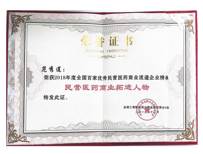 • 2018年度全國(guó)百家優(yōu)秀民營(yíng)醫(yī)藥商業(yè)流通企業(yè)榜單-民營(yíng)醫(yī)藥商業(yè)拓展人物-范秀蓮